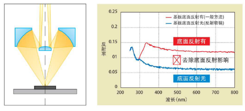 膜或者玻璃等透明基板样品,受基板内部反射的影响,无法正确测量。OPTM系列使用物镜,可以物理去除内部反射,即使是透明基板也可以实现高精度测量。此外,对具有光学异向性的膜或SiC等样品,也可完全不受其影响,单独测量上面的膜。