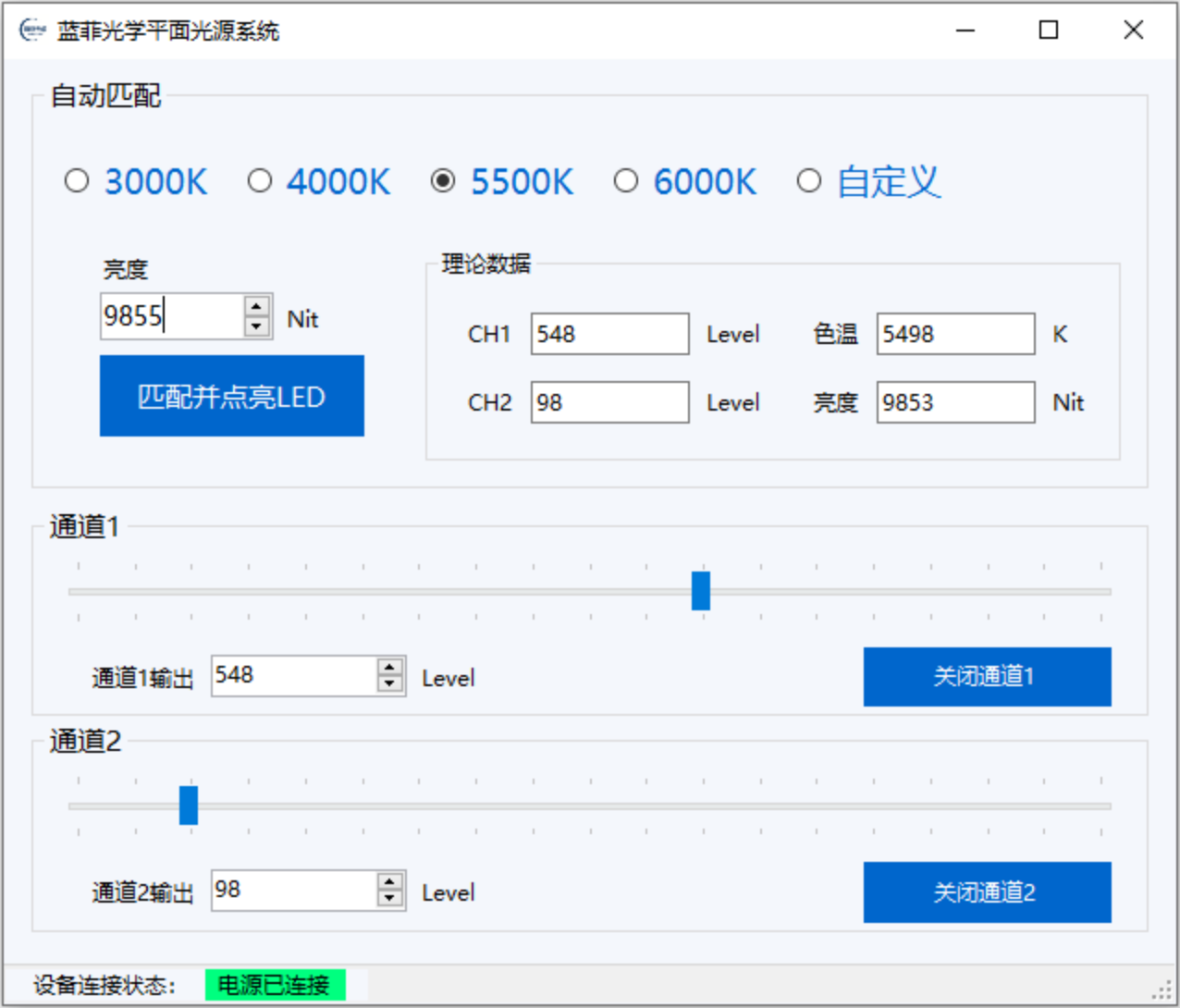 蓝菲光学LED面板光源是一款可用于相机模组,成像亮度计或传感器产线校准的光源模拟器。选用两组高低色温的LED模块实现在校准范围内任意色温(3000K ~ 6000K)和任意亮度(300 ~ 20000Nit或100 ~ 15000Nit)的大动态范围输出。并且保证有效发光区域内95%以上的面均匀性。电源输出调节分辨率高达1000级,实现高精度的亮度和色温输出。我们提供了有效发光区域60 x 60mm和200 x 200mm两种尺寸大小的设备型号可供用户选择。可提供不同语言版本的SDK接口使用户可以方便集成到自有控制软件。